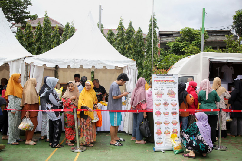 Kementerian Perdagangan RI bersama Dinas Perindustrian Perdagangan Koperasi Usaha Kecil dan Menengah (PPKUKM) DKI Jakarta menggelar Pasar Murah Ramadan 2024 di RPTRA Mustika Jalan Kerja Bakti, Kecamatan Kramat Jati, Jakarta Timur, Jumat (15/3). Beberapa sembako mudah yang dijual di Pasar Murah ini yakni beras, minyak goreng, gula, garam, tepung, daging dan telur. #ramadan2024