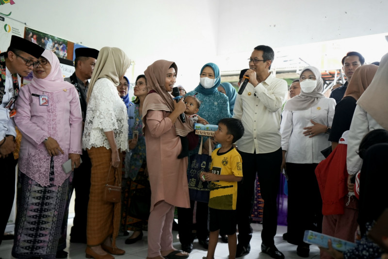 Penjabat (Pj) Gubernur DKI Jakarta, Heru Budi Hartono didampingi Pj Ketua Tim Penggerak Pemberdayaan dan Kesejahteraan Keluarga (TP PKK) Mirdiyanti Heru, memantau intervensi percepatan penurunan stunting terintegrasi di RPTRA Intiland Teduh, Cilincing, Jakarta Utarau, Jumat (15/3). Kegiatan ini merupakan upaya penurunan angka stunting di antaranya pelaksanaan Posyandu anak, pemberian suplemen tablet tambah darah, serta pemenuhan pangan bergizi dan pola pangan yang memenuhi syarat Beragam, Bergizi Seimbang dan Aman (B2SA).