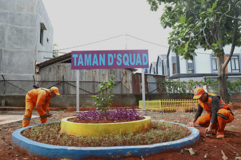Petugas Penanganan Prasarana dan Sarana Umum (PPSU) Kelurahan Duren Sawit membuat taman D Squad di Jalan Swadaya, Duren Sawit, Jakarta Timur, Rabu (6/3). Pembuatan taman ini merupakan program kawasan unggulan triwulan pertama tahun 2024 dengan berbagai fasilitas mulai dari area permainan anak, tempat refleksi, area urban farming dan berbagai tanaman hias.