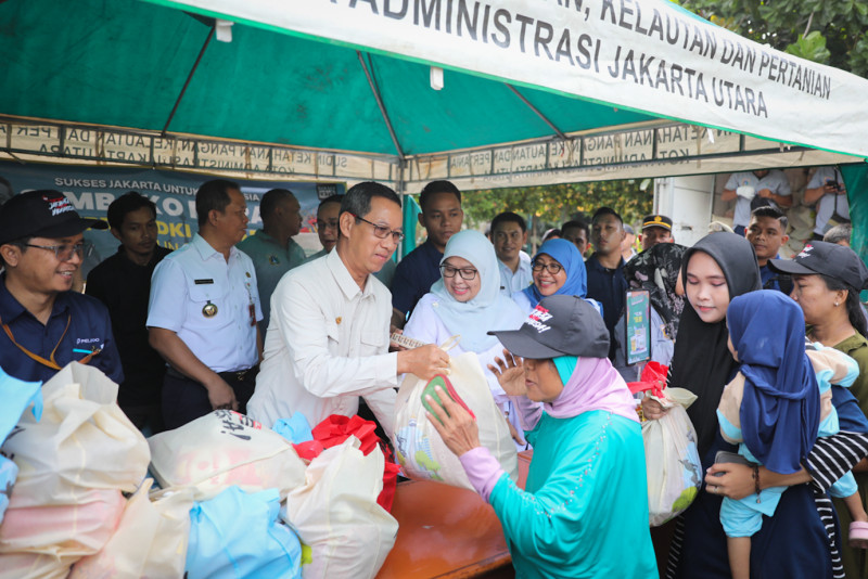 Penjabat (Pj) Gubernur DKI Jakarta, Heru Budi Hartono meninjau penjualan paket sembako murah di Kantor Kecamatan Cilincing, Jakarta Utara, Rabu (6/3). Pemprov DKI Jakarta melalui Perumda Pasar Jaya mendistribusikan 1.000 paket sembako murah berisi 5 kilogram beras, 2 liter minyak goreng, 1 kilogram gula dan 1 kilogram tepung terigu yang dijual dengan harga Rp100.000.