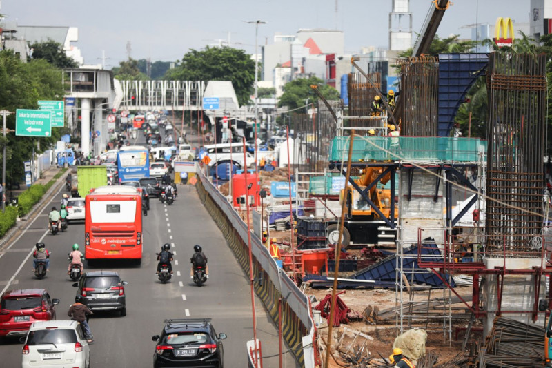 Sejumlah pekerja melakukan pembangunan konstruksi LRT Jakarta fase 1B rute Velodrome-Manggarai di Jalan Pemuda, Pulo Gadung, Jakarta Timur, Kamis (29/2). Per Februari 2024, progres LRT Jakarta memasuki pekerjaan struktur layang atau viaduct dengan pengeboran pondasi (boredpile) di 129 titik.