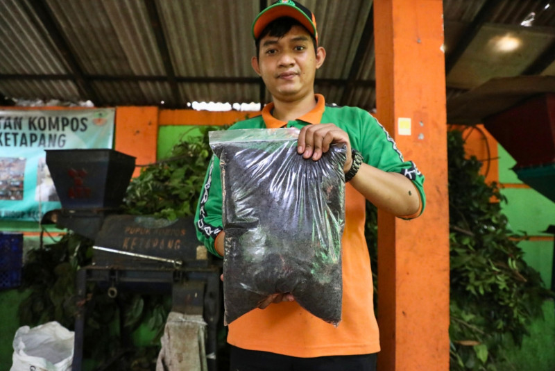 Petugas Satuan Pelaksana Lingkungan Hidup (Satpel LH) Kecamatan Gambir mengolah limbah sampah organik menjadi kompos di Tempat Pengolahan Sampah Reduce, Reuse and Recycle (TPS 3R) Ketapang, Jalan Kyai Haji Zainul Arifin, Duri Pulo, Jakarta Pusat, Selasa (27/2). Dalam sebulan petugas dapat membuat 100 kilogram pupuk kompos.