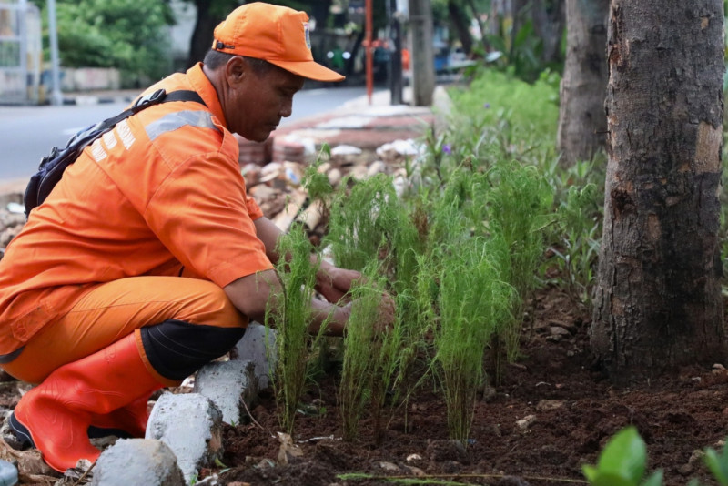 Petugas Penanganan Prasarana dan Sarana Umum (PPSU) Kelurahan Tebet Timur mengerjakan penataan kawasan unggulan triwulan I di Jalan Tebet Timur Dalam III, Tebet, Jakarta Selatan, Rabu (28/2). Penataan kawasan yang memilki luas 150 persegi ini nantinya akan dihiasi berbagai tanaman hias seperti patah tulang, cemara air, lavender dan tanaman pisang hias.