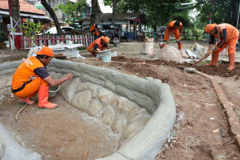 Petugas Penanganan Prasarana dan Sarana Umum (PPSU) Kelurahan Koja mengerjakan penataan kawasan unggulan triwulan I di Jalan Cipeucang 1, Koja, Jakarta Utara. Selasa (27/2). Penataan kawasan seluas 200 meter persegi ini akan dilengkapi dengan kolam ikan hias, tempat refleksi serta wahana permainan anak.