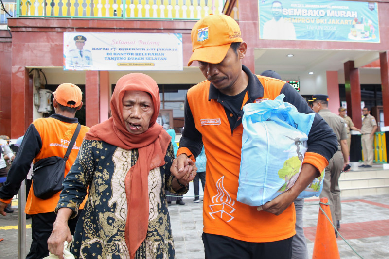 Sejumlah warga prioritas membeli paket sembako murah di Halaman Kelurahan Tanjung Duren Selatan, Grogol Petamburan, Jakarta Barat, Senin (26/2). Warga prioritas yang terdiri dari lansia, ibu hamil dan orang tua yang membawa anak kecil ini diberikan jalur khusus agar mempermudah mereka saat membeli paket sembako murah.