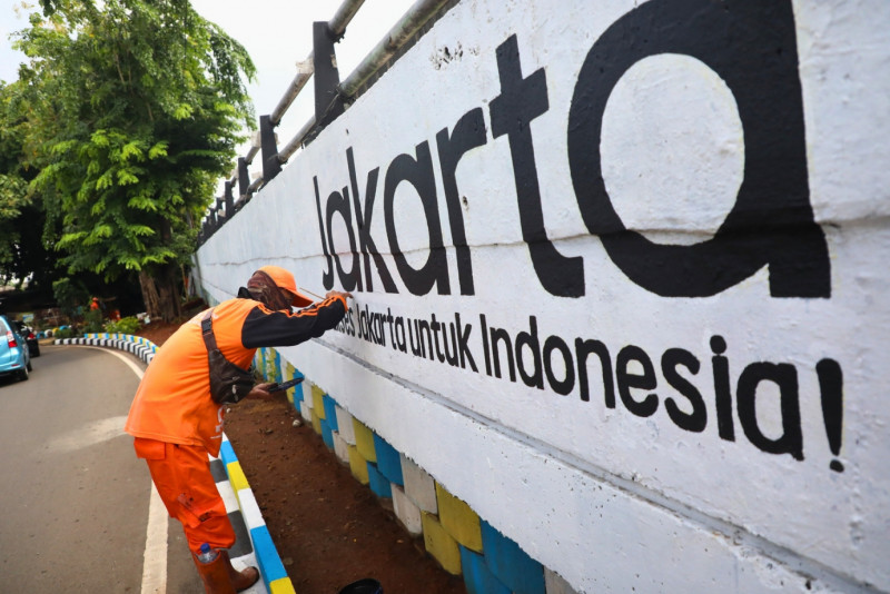 Sejumlah petugas Penanganan Prasarana dan Sarana Umum (PPSU) Kelurahan Utan Kayu Utara mengerjakan penataan unggulan Triwulan pertama di Jalan Pramuka Bakti, Matraman, Jakarta Timur, Kamis (15/2). Penataan kawasan ini memiliki panjang 150 sentimeter dihiasi dengan mural serta tanaman hias mulai dari pucuk merah, bougenville, asoka, lili paris, miana, patah tulang dan gandarusa.
