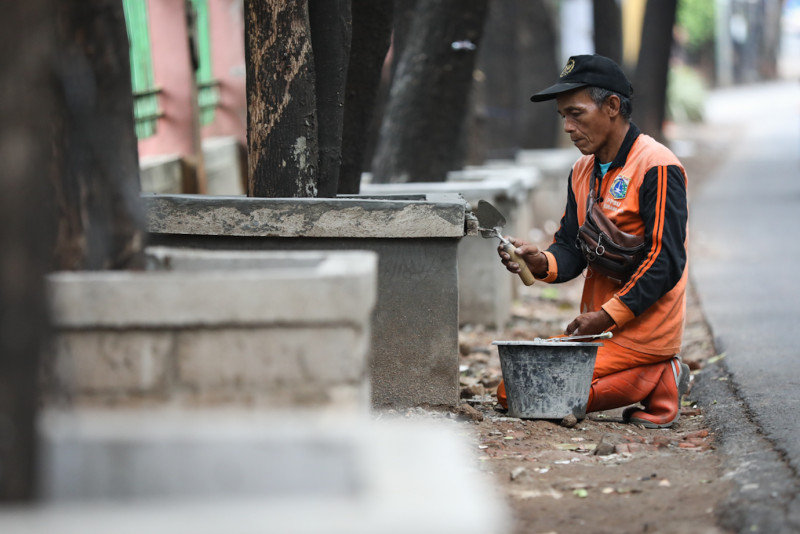 Sebanyak delapan petugas Penanganan Prasarana dan Sarana Umum (PPSU) Kelurahan Lubang Buaya mengerjakan penataan kawasan unggulan triwulan I di Jalan Monumen Pancasila Sakti, Cipayung, Jakarta Timur, Kamis (15/2). Untuk penataan awal kawasan tersebut, PPSU Lubang Buaya mengerjakan pembuatan bak pohon permanen di sisi jalan sepanjang 170 meter.