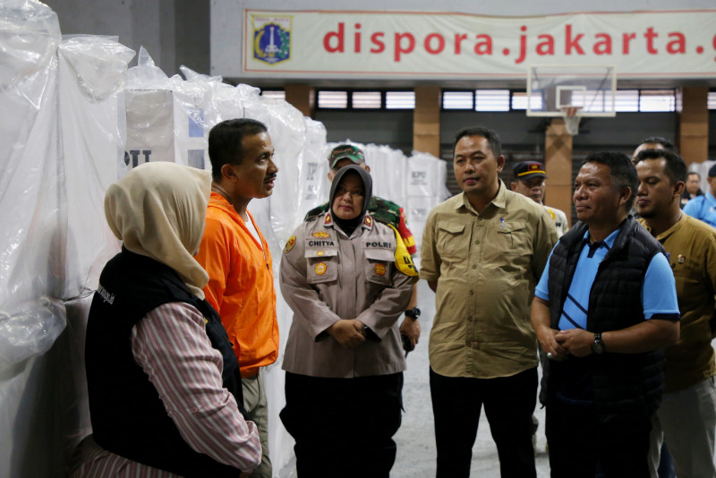 Wali Kota Jakarta Timur, Muhammad Anwar meninjau persiapan rekapitulasi surat suara tingkat Panitia Pemilihan Kecamatan (PPK) di Gelanggang Jakarta Timur, Jalan Otto Iskandar Dinata Raya, Kelurahan Bidara Cina, Jatinegara, Jakarta Timur, Jumat (16/2). Sebelumnya, Komisi Pemilihan Umum (KPU) Jakarta Timur telah menarik kembali logistik pemilu 2024 sejumlah 3.624 kotak suara dari 906 Tempat Pemungutan Suara (TPS) di Kecamatan Jatinegara, Jakarta Timur pada Kamis (15/2) untuk dilakukan rekapitulasi tingkat PPK.