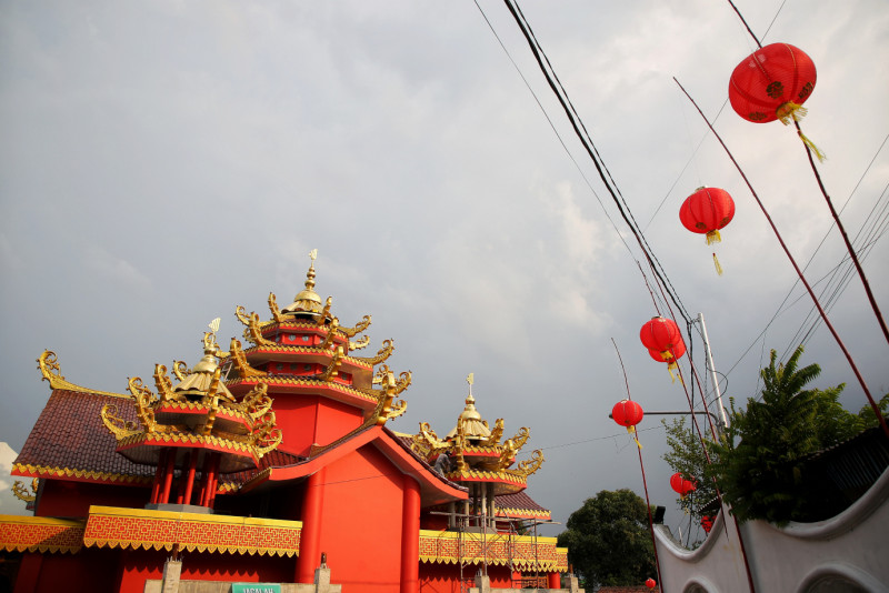 Dewan Kemakmuran Masjid (DKM) Tjia Kang Ho memasang ratusan lampion berwarna merah dengan bahan kertas di sekitar Masjid Tjia Kang Ho, Jalan H. Soleh RT 02/07, Pekayon, Pasar Rebo, Jakarta Timur, Kamis (8/2). Pemasangan lampion ini merupakan tradisi yang biasa dilakukan setiap tahun, jelang Tahun Baru Imlek. #Imlek2024