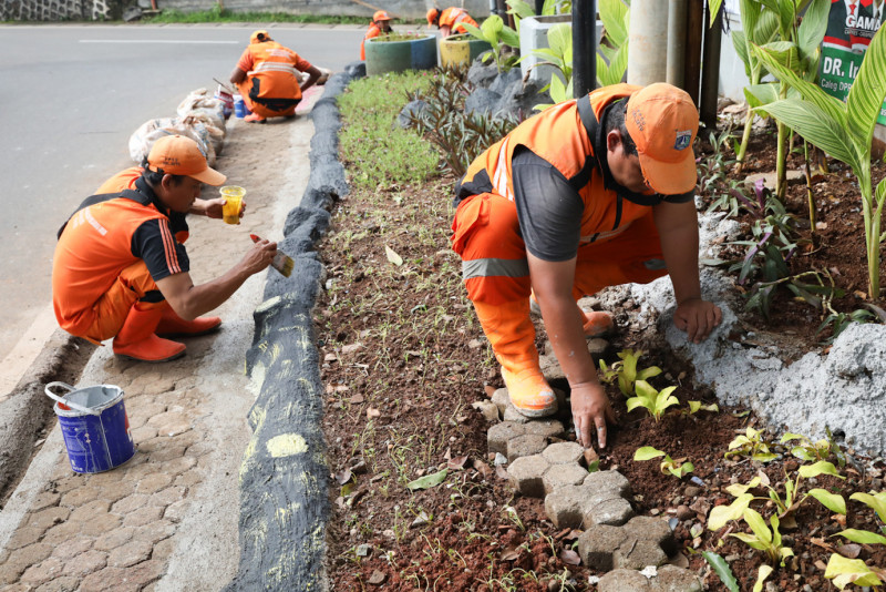 Sebanyak enam petugas Penanganan Prasarana dan Sarana Umum (PPSU) Kelurahan Setu melakukan penataan kawasan unggulan triwulan I di Jalan Kramat Aris RT 05/03, Cipayung, Jakarta Timur, Rabu (7/2). Penataan kawasan tersebut meliputi pembuatan taman dan jalur pejalan kaki di lahan tidur yang sebelumnya tidak terawat.