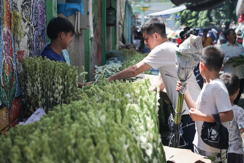 Sejumlah pedagang bunga sedap malam melayani pembeli di Pasar Bunga Rawa Belong, Kebon Jeruk, Jakarta Barat, Kamis (8/2). Permintaan bunga sedap malam meningkat jelang perayaan Tahun Baru Imlek 2575 Kongzili yang jatuh pada Sabtu, 10 Februari 2024. #Imlek2024