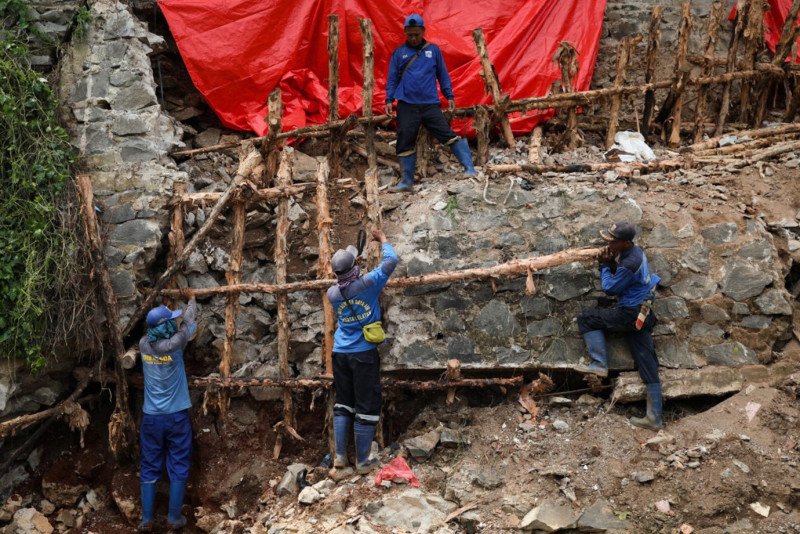 Petugas Satuan Pelaksana Sumber Daya Air (Satpel SDA) Kecamatan Jagakarsa dan PPSU Kelurahan Cipedak melakukan penanganan tebing longsor di Jalan Timbul III B, Cipedak, Jagakarsa, Jakarta Selatan, Selasa (6/2). Penanganan tebing longsor yang melibatkan enam personel Satpel SDA, lima petugas PPSU dan satu ekskavator spider tersebut ditargetkan rampung pekan ini.