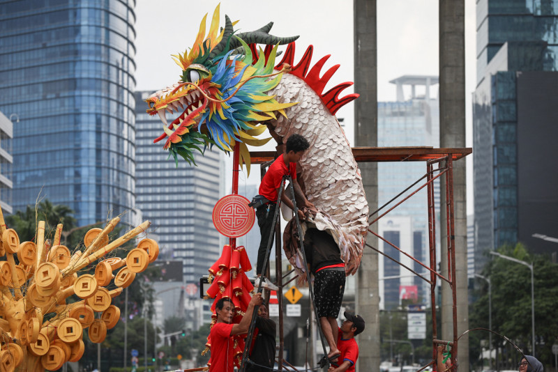 Sejumlah pekerja mengerjakan pembuatan instalasi naga dan ornamen bernuansa Imlek di Bundaran Hotel Indonesia (HI), Jalan Sudirman-Thamrin, Menteng, Jakarta Pusat, Rabu (7/2). Dinas Pertamanan dan Hutan Kota (Distamhut) DKI Jakarta memasang instalasi dan ornamen tersebut dalam rangka menyemarakkan Tahun Baru Imlek 2575 Kongzili yang jatuh pada 10 Februari 2024. #Imlek2024