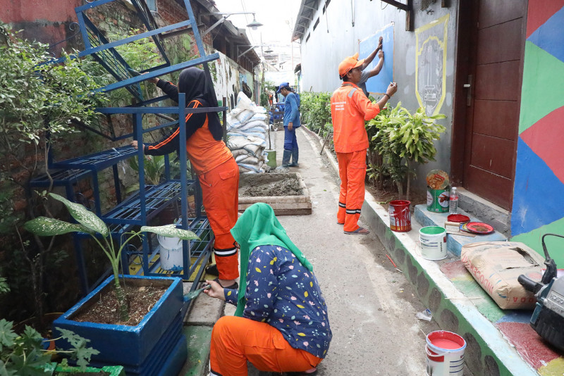 Petugas gabungan dari Penanganan Prasarana dan Sarana Umum (PPSU) dan Satuan Pelaksana Sumber Daya Air (Satpel SDA) mengerjakan penataan kawasan unggulan di Jalan Kali Pasir, RT 10/01, Cikini, Menteng, Jakarta Pusat, Rabu (7/2).