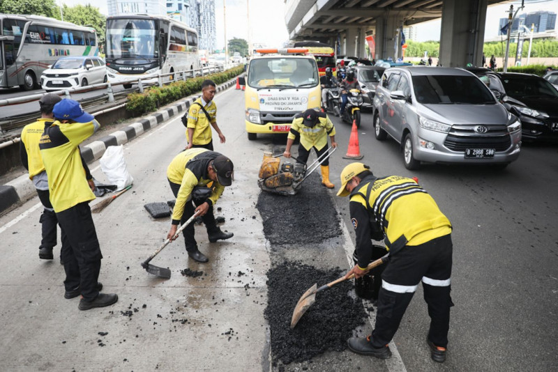 Petugas Dinas Bina Marga DKI Jakarta melakukan penambalan aspal di Jalan Gatot Subroto, Pancoran, Jakarta Selatan, Jumat (2/2). Penambalan aspal berlubang tersebut dilakukan agar tidak membahayakan pengendara.