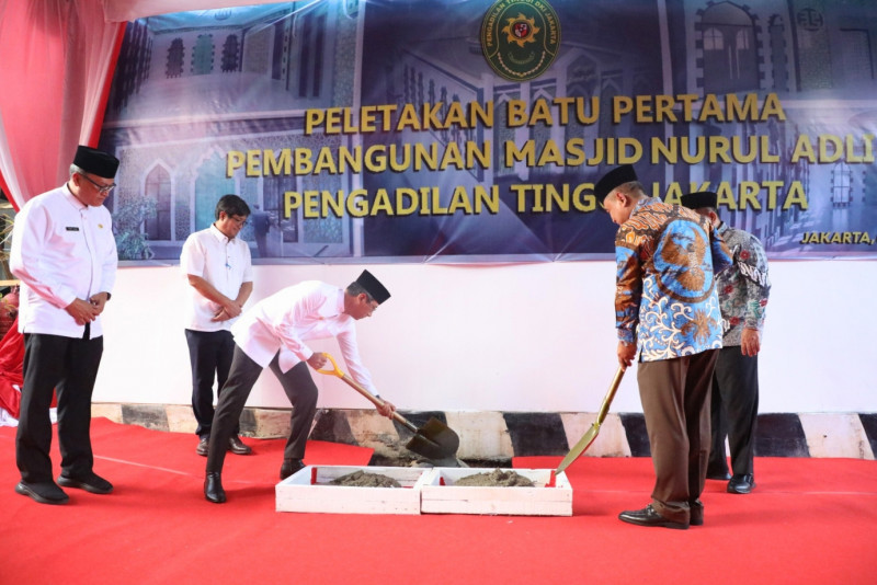Penjabat (Pj) Gubernur DKI Jakarta, Heru Budi Hartono menghadiri peletakan batu pertama pembangunan Masjid Nurul Adli di Pengadilan Tinggi Jakarta, Jalan Letjend Soeprapto, Cempaka Putih Timur, Cempaka Putih, Jakarta Pusat, Jumat (2/1). Sebelum dilakukan prosesi peletakan batu pertama Pemprov DKI menyerahkan surat Izin Mendirikan Bangunan (IMB) Masjid Nurul Adli Pengadilan Tinggi Jakarta.