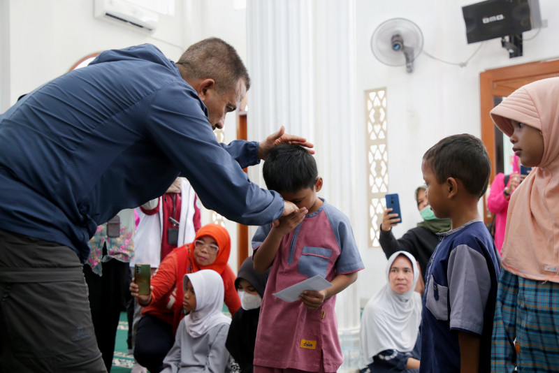 Wali Kota Jakarta Timur, Muhammad Anwar memberikan santunan pada anak yatim dan berkebutuhan khusus di Masjid Mahatma, Pondok Ranggon, Cipayung, Jakarta Timur, Jumat (2/2). Santunan yang diberikan berupa uang tunai serta paket sembako, selain itu walikota juga memberikan bantuan pada anak berkebutuhan khusus berupa jaminan pendidikan dan tempat tinggal.