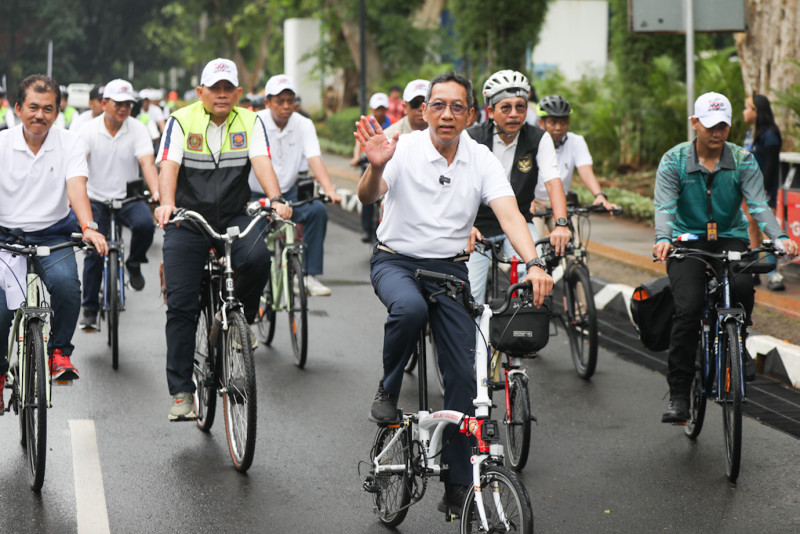 Penjabat (Pj) Gubernur DKI Jakarta, Heru Budi Hartono bersama sejumlah pejabat Pemprov DKI bersepeda santai saat pelaksanaan Hari Bebas Kendaraan Bermotor (HBKB) di Jalan Sudirman-Thamrin, Jakarta Pusat, Minggu (28/1). Rute bersepeda rombongan Pemprov DKI Jakarta dimulai dari Balai Kota menuju kawasan Senayan.