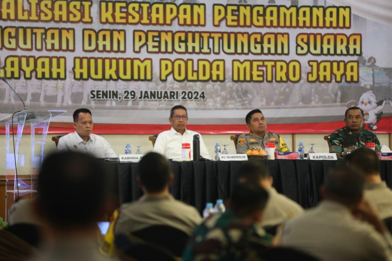 Penjabat (Pj) Gubernur Provinsi DKI Jakarta, Heru Budi Hartono menghadiri rapat koordinasi (Rakor) optimalisasi kesiapan pengamanan pemungutan dan penghitungan suara di wilayah hukum Polda Metro Jaya, bersama jajaran Polda Metro Jaya dan Kodam Jaya, di Hotel Sahid, Jakarta Pusat, Senin (29/1). Dalam sambutannya Pj Gubernur mengajak seluruh pihak bersinergi untuk mendukung kelancaran pelaksanaan setiap tahapan Pemilihan Umum (Pemilu) 2024.