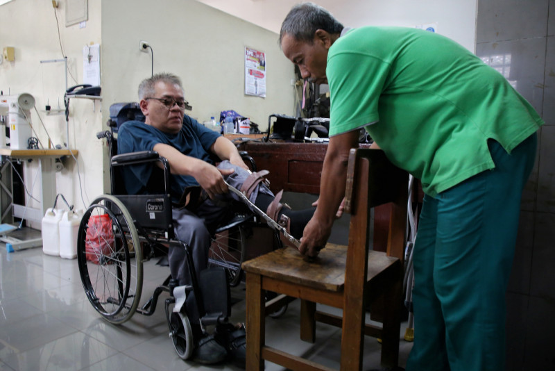 Pekerja menyelesaikan pembuatan sepatu penyangga untuk warga berkebutuhan khusus di Unit Ortotik Yayasan Pembinaan Anak Cacat (YPAC) Jakarta, Kebayoran Baru, Jakarta Selatan, Jumat (26/1). Sepatu yang dibuat di tempat ini antara lain seperti sepatu ortopedi dan sepatu penyangga khusus yang disesuaikan dengan kebutuhan serta kondisi fisik berdasarkan diagnosa para ahli.