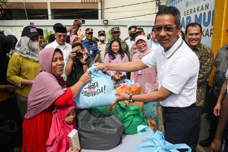 Penjabat (Pj) Gubernur DKI Jakarta, Heru Budi Hartono meninjau pasar sembako murah di Kantor Kelurahan Jembatan Lima, Tambora, Jakarta Barat, Jumat (26/1). Pj Gubernur juga melihat pelayanan di loket Pelayanan Terpadu Satu Pintu (PSTP) kelurahan tersebut usai meninjau pasar sembako murah.