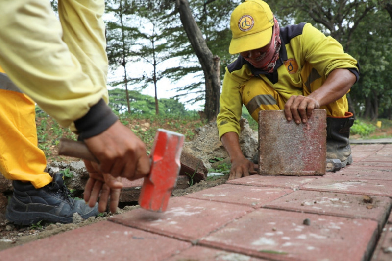 Empat Petugas Satuan Pelaksana (Satpel) Bina Marga memperbaiki trotoar di Jalan RS Soekamto, Malaka Jaya, Duren Sawit, Jakarta Timur, Rabu (17/1). Perbaikan trotoar sepanjang lima meter dengan lebar 60 sentimeter ini dilakukan karena trotoar sudah rusak termakan usia.