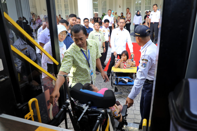 Penjabat (Pj) Gubernur DKI Jakarta, Heru Budi Hartono meluncurkan operasional lima bus sekolah berkebutuhan khusus di pendopo Balaikota, Jalan Medan Merdeka Selatan, Gambir, Jakarta Pusat, Rabu (16/1). Kelima armada bus sekolah kebutuhan khusus tersebut akan beroperasi dengan rute Rorotan - Marunda (SLB Negeri 8), Plumpang - Sunter Kemayoran (SLB Negeri 9), serta Tiga rute lainnya berangkat dari Kalideres Jakarta Barat, Muara Baru Jakarta Utara dan Lubang Buaya Jakarta Timur dengan tujuan akhir menuju sekolah YPAC Kebayoran Baru.