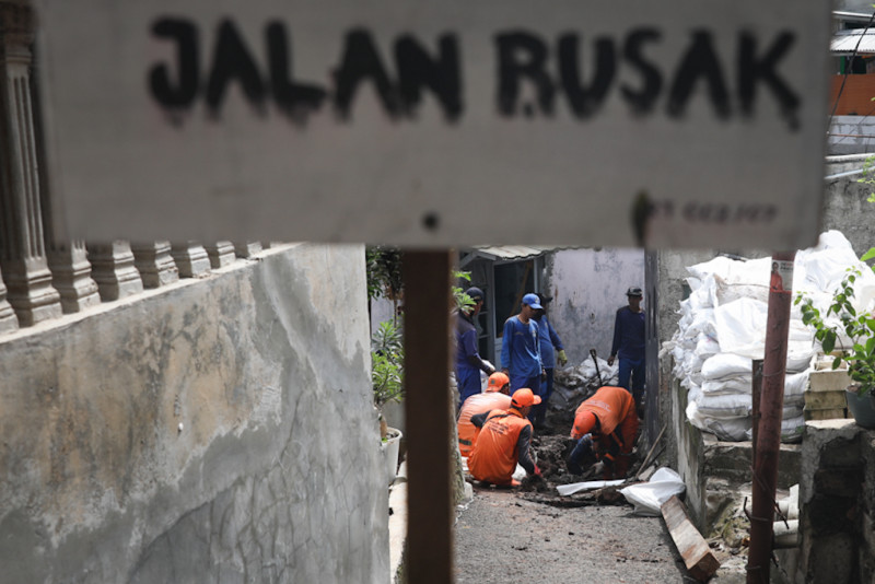 Petugas Suku Dinas Sumber Daya Air (Sudin SDA) dan PPSU Kelurahan Baru memperbaiki saluran amblas di Jalan H. Remaih, Pasar Rebo, Jakarta Timur, Rabu (17/1). Perbaikan saluran akan dilakukan dengan memasang beton u-ditch berukuran 40 sentimeter dan ditargetkan selasai pada dua pekan ke depan.
