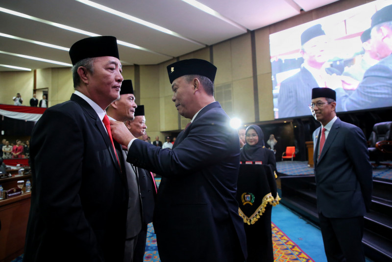 Penjabat (Pj) Gubernur DKI Jakarta, Heru Budi Hartono menghadiri rapat paripurna pengucapan sumpah dan janji pengganti antar waktu (PAW) tiga anggota DPRD DKI Jakarta dari Fraksi Partai Demokrasi Indonesia Perjuangan (PDI-P) sisa masa jabatan 2019-2024 di Gedung DPRD DKI Jakarta, Gambir, Jakarta Pusat, Rabu (17/1). Ketiga anggota dewan yang dilantik yaitu Boyke Hasiholan Simanjuntak untuk menggantikan Steven Setia Budi Musa, Simon Sitorus untuk menggantikan Gembong Warsono, dan Sunggul Sirait untuk menggantikan Cinta Mega.