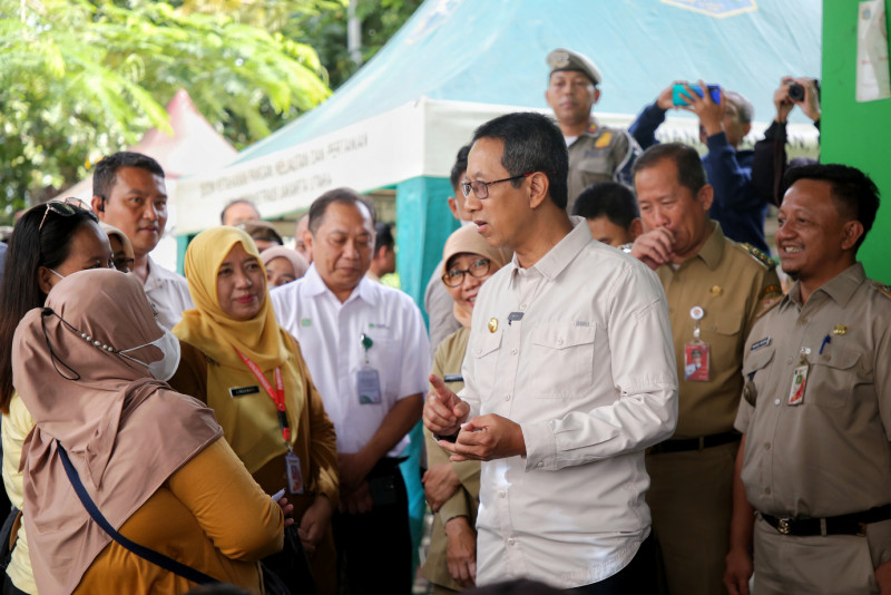 Penjabat (Pj) Gubernur DKI Jakarta, Heru Budi Hartono meninjau kegiatan sembako murah di Kantor Kelurahan Penjaringan, Jakarta Utara, Selasa (16/1). Selain meninjau kegiatan sembako murah Pj Gubernur juga melihat sejumlah pelayanan yang ada.
