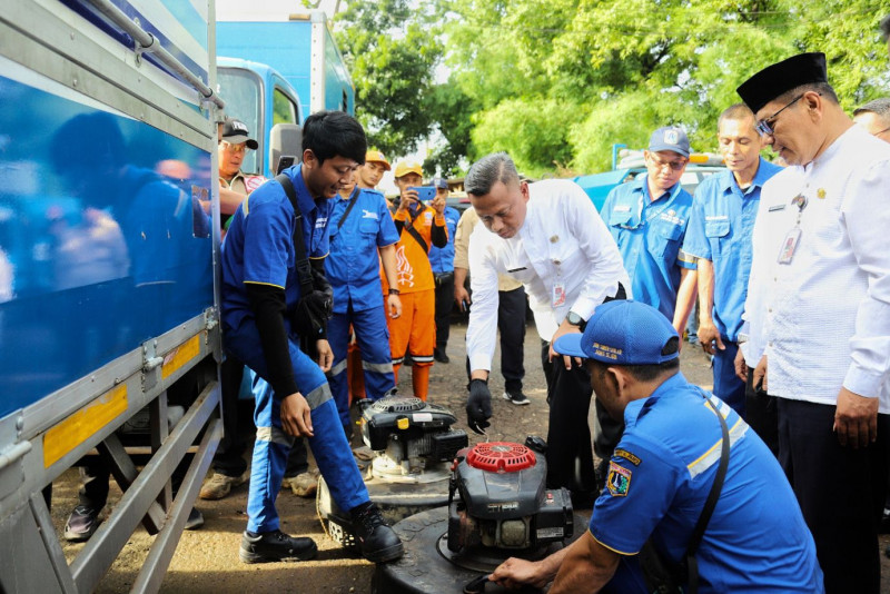 Wali Kota Jakarta Selatan, Munjirin memimpin apel kesiapsiagaan banjir di Lapangan Waduk Rawa Minyak, Jalan Aup RT 04/10, Pasar Minggu, Pasar Minggu. Jumat (12/1). Dalam apel kesiapsiagaan ini Wali Kota Jakarta Selatan mengecek langsung sejumlah unit alat pengendali banjir, seperti pompa portabel, perahu karet, truk dan ekskavator.