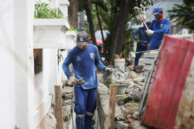 Petugas Suku Dinas Sumber Daya Air (Sudin SDA) Jakarta Pusat memperbaiki saluran di Jalan Cempaka Putih Timur IX, Cempaka Putih, Jakarta Pusat, Kamis (11/1). Perbaikan yang dikerjakan oleh 17 petugas tersebut dilakukan untuk menambah kapasitas saluran agar air mengalir lebih lancar.