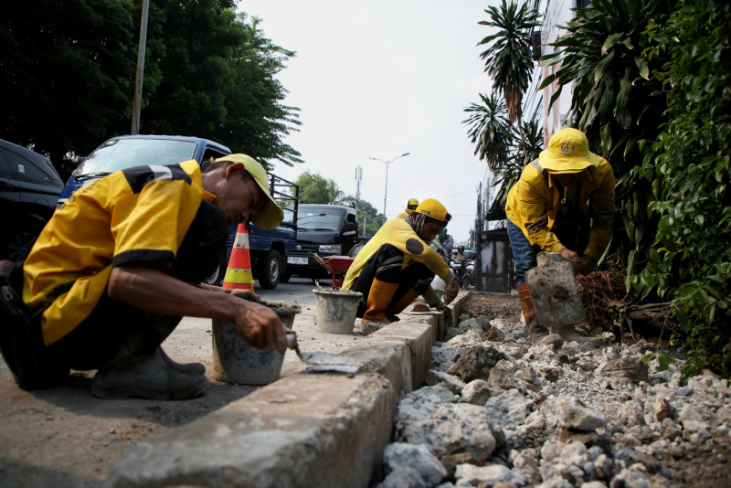 Petugas Satuan Bina Marga Kecamatan Ciracas membangun trotoar baru di Jalan Raya Bogor, Pekayon, Pasar Rebo, Jakarta Timur, Kamis (7/12). Pembangunan trotoar sepanjang 80 meter dan lebar 120 sentimeter sudah mencapai 80 persen ini dilakukan untuk memberikan kenyamanan kepada para pejalan kaki. (Foto: Andri Widiyanto/beritajakarta.id)
