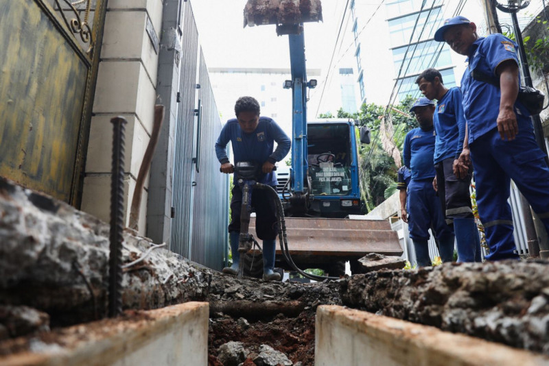 Petugas Suku Dinas Sumber Daya Air (Sudin SDA) Jakarta Selatan mengerjakan perbaikan saluran air di Jalan Tulodong Bawah VII, Kelurahan Senayan, Kebayoran Baru, Jakarta Selatan, Kamis (7/12). Perbaikan dilakukan pada saluran air sepanjang 50 meter dengan memasang beton u-ditch berukuran 40x40 sentimeter. Rencana perbaikan ini memakan waktu satu bulan. (Foto: Nugroho Sejati/beritajakarta.id)