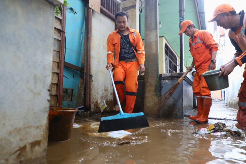 Petugas Penanganan Prasarana dan Sarana Umum (PPSU) membersihkan lumpur dan sampah sisa genangan di permukiman warga Rawajati, Pancoran, Jakarta Selatan, Kamis (30/11). Pembersihan dilakukan seiring surutnya banjir yang menggenang kawasan RW 07. (Foto: Mochamad Tresna Suheryanto/beritajakarta.id)