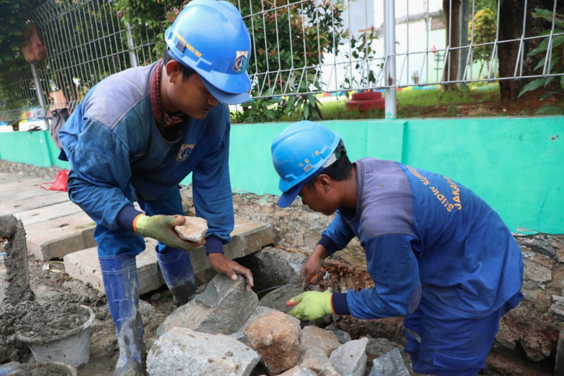 Enam Petugas Satuan Pelaksana Sumber Daya Air (Satpel SDA) Kecamatan Duren Sawit memperbaiki dinding saluran yang longsor di Jalan Bunga Rampai Raya, Kelurahan Malaka Jaya, Jakarta Timur, Rabu (29/11). Turap yang diperbaiki sepanjang 50 meter dan lebar 60 sentimeter ini dilakukan karena dinding turap sudah rusak termakan usia. Perbaikan dimulai dari 22 November 2023 ditargetkan rampung pada tanggal 6 Desember mendatang. (Foto: Mochamad Tresna Suheryanto/beritajakarta.id)
