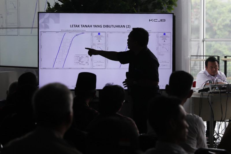 Pemprov DKI Jakarta menggelar sosialisasi rencana pembangunan jalur stasiun dan fasilitas penunjang proyek Kereta Cepat Indonesia China (KCIC) kepada warga terdampak pembangunan di Kantor KCIC Halim, Kecamatan Makasar, Jakarta Timur, Selasa (28/11). Sosialisasi yang meliputi pemaparan dan sesi tanya-jawab tersebut terkait pembangunan jalur akses menuju Stasiun KCIC Halim dari arah Jalan Inspeksi Kalimalang. (Foto: Nugroho Sejati/beritajakarta.id)