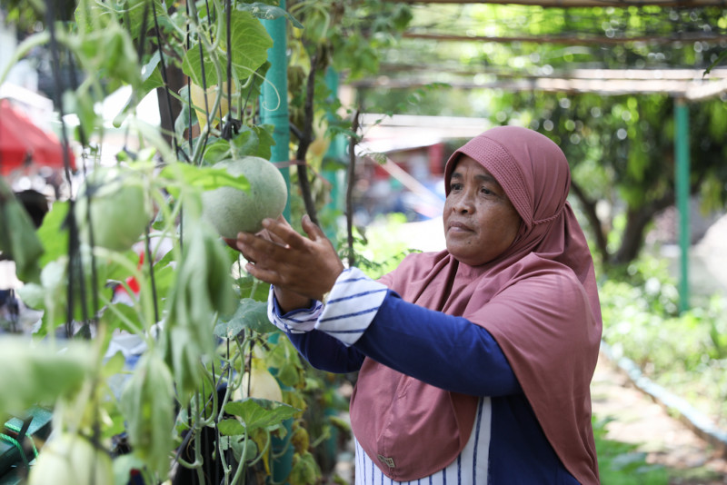 Sejumlah warga yang tergabung dalam Kelompok Tani Anak Kreasi Remaja Kampung Baru (Poktan Akrab) memanfaatkan lahan tidur di Jalan Kayu Mas Raya, Pulogadung, Jakarta Timur. Poktan Akrab juga merupakan binaan Dinas Ketahanan Pangan, Kelautan, Pertanian (KPKP) DKI Jakarta tersebut mengelola taman penghijauan yang berisi tanaman produktif dan toga secara swadaya. (Foto: Nugroho Sejati/beritajakarta.id)