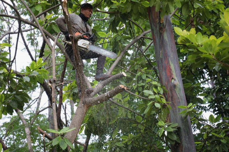 Lima pohon di Jalan Kolonel Sugiono, Duren Sawit, Jakarta Timur ditoping oleh tujuh Petugas Suku Dinas Pertamanan dan Hutan Kota (Distamhut) Jakarta Timur, Senin (27/11). Penopingan dilakukan karena kondisi daunnya yang sudah lebat sehingga membahayakan pengendara yang melintasi kawasan itu. (Foto: Mochamad Tresna Suheryanto/beritajakarta.id)