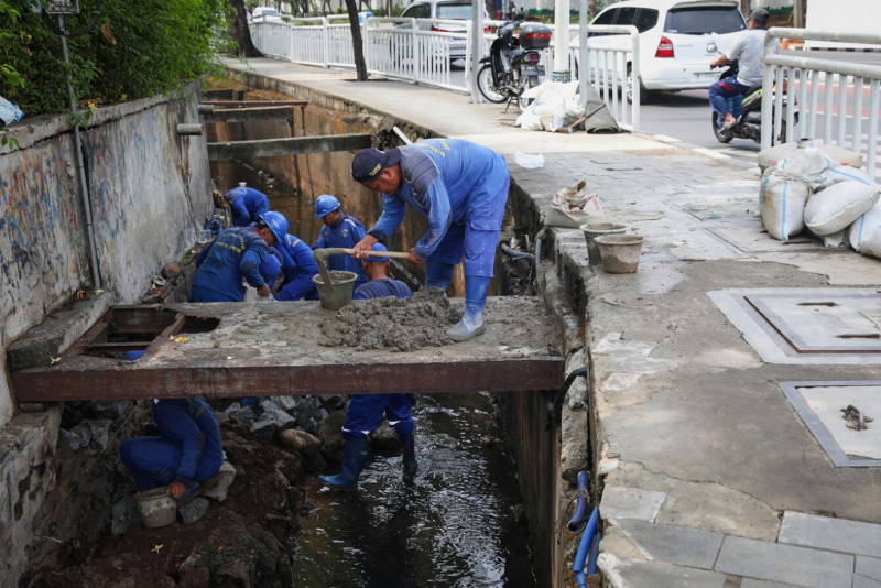 Delapan petugas Suku Dinas Sumber Daya Air (Sudin SDA) Jakarta Timur melakukan perbaikan turap saluran penghubung (Phb) di Jalan Taman Mini I, Kecamatan Makasar, Jakarta Timur, Senin (27/11). Perbaikan turap sepanjang 20 meter dengan kedalaman 2,5 meter ini untuk mencegah terjadinya longsor. (Foto: Nugroho Sejati/beritajakarta.id)