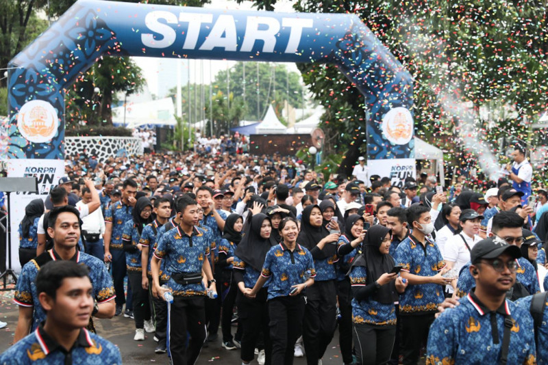 Meriahkan HUT ke-52 Korps Pegawai Republik Indonesia (KORPRI) sebanyak 4.000 Aparatur Sipil Negera (ASN) mengikuti jalan sehat (fun walk) yang dimulai di Kantor Kementerian Pemuda dan Olahraga (Kemenpora), Tanah Abang, Jakarta Pusat, Minggu (26/11). Para peserta melakukan jalan sehat sejauh 3,52 kilometer melintasi Jalan Gerbang Pemuda, Jalan Gatot Subroto, Jalan Palmerah Timur, dan Jalan Gelora. (Foto: Nugroho Sejati/beritajakarta.id)