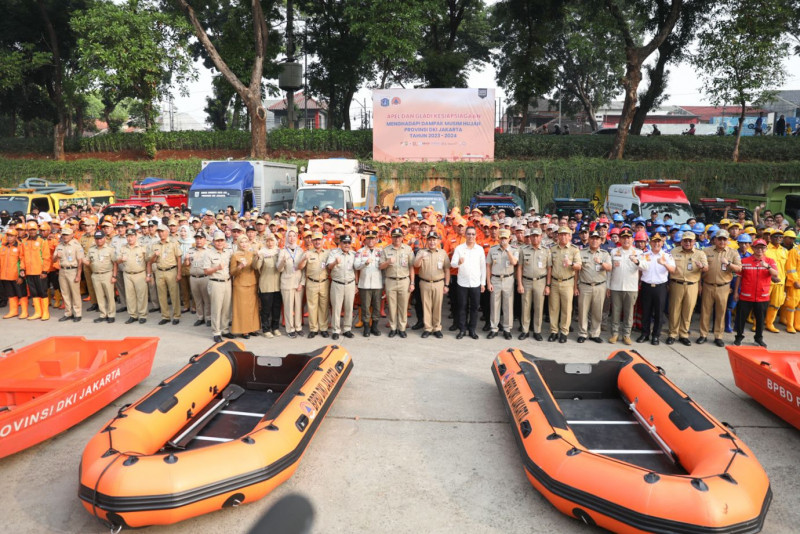 Penjabat (Pj) Gubernur DKI Jakarta, Heru Budi Hartono, memberikan arahan pada apel dan gladi kesiapsiagaan menghadapi musim hujan di Pintu Air Malaka Sari Kanal Banjir Timur (KBT), Duren Sawit, Jakarta Timur, Jumat (24/11). Dalam apel yang diikuti 300 personel gabungan ini, Pemprov DKI Jakarta mematangkan kesiapan menghadapi puncak musim hujan yang diprediksi akan terjadi pada bulan Februari tahun depan. (Foto: Nugroho Sejati/beritajakarta.id)