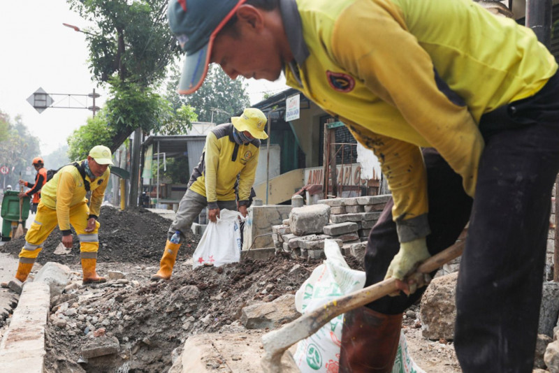Satuan Petugas (Satgas) Bina Marga Kecamatan Kramat Jati melakukan pembangunan trotoar di sisi Jalan H. Bokir Bin Dji\'un, Kramat Jati, Jakarta Timur, Jumat (10/11). Pembangunan trotoar di simpang Hek tersebut dilakukan untuk memberikan keamanan dan kenyamanan pejalan kaki yang melintas.