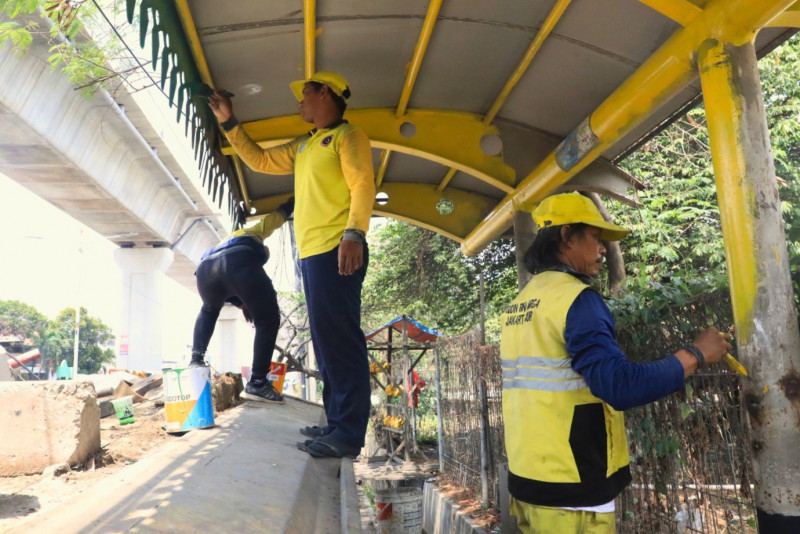 Petugas Suku Dinas Bina Marga Jakarta Timur melakukan pengecatan halte bus di Jalan Raya Bekasi, Cakung, Jakarta Timur, Senin (6/11). Pengerjaan ini dilakukan untuk menambah kenyamanan bagi pengguna angkutan umum.