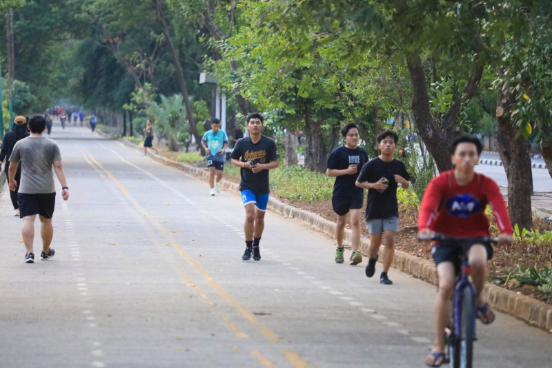 Melihat aktivitas warga menghabiskan waktu sore dengan berolahraga di kawasan Kanal Banjir Timur (KBT), Jalan Kolonel Sugiono, Duren Sawit, Jakarta Timur, Selasa (7/11). Sejumlah olahraga seperti jogging, bermain sepak bola, buku tangkis dan menikmati fitnes outdoor.