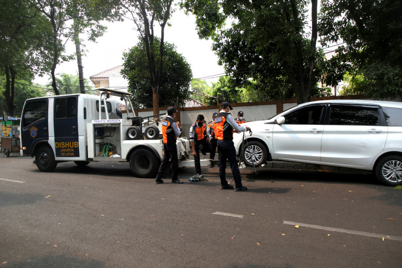 Petugas Suku Dinas Perhubungan (Sudinhub) Jakarta Selatan melakukan penertiban pada kendaraan yang parkir sembarangan di Jalan DPR Raya, Rawajati, Pancoran, Jakarta Selatan. Selama bulan Oktober 2023 sebanyak 1.164 kendaraan ditindak Sudinhub Jakarta Selatan lantaran parkir sembarangan dilokasi yang tidak semestinya.