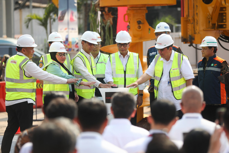Penjabat (Pj) Gubernur DKI Jakarta, Heru Budi Hartono bersama Menteri Perhubungan (Menhub) RI, Budi Karya Sumadi melakukan groundbreaking proyek LRT Jakarta fase 1B di depan Stasiun LRT Velodrome, Pulo Gadung, Jakarta Timur, Senin (30/10). Proyek LRT Jakarta fase 1B akan memiliki rute Stasiun Velodrome-Manggarai dengan panjang lintasan sejauh 6,4 kilometer.