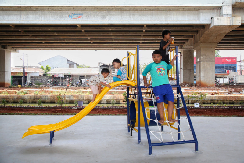 Melihat Taman Interaksi Warga di Kolong Tol Becakayu RW 10 Jalan Inspeksi Tarum Barat, Kelurahan Cipinang Melayu, Makasar, Jakarta Timur. Taman ini dibangun atas hasil sinergi pihak Kelurahan Cipinang Melayu dengan PT Pegadaian.