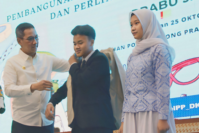 Penjabat (PJ) Gubernur Provinsi DKI Jakarta, Heru Budi Hartono resmikan Prabu (Pelajar Duta Trantibum) Jakarta Tahun 2023 di Aula Ki Hajar Dewantara, Kantor Dinas Pendidikan Provinsi DKI Jakarta, Jalan Gatot Subroto, Setiabudi, Jakarta Selatan, Selasa (24/10). Sebanyak 500 pelajar SMA dan sederajat dari 20 sekolah yang dilantik sebagai Prabu Jakarta diharapkan menjadi pelopor, dan agen yang bisa merubah untuk kelangsungan trantibum yang baik.
