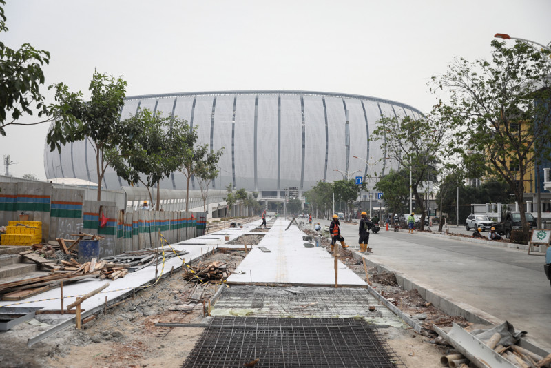 Sejumlah pekerja mengerjakan proyek pembangunan trotoar di sekitar Jakarta International Stadium (JIS), Jalan Danau Sunter Barat, Tanjung Priok, Jakarta Utara, Selasa (24/10). Dinas Bina Marga DKI Jakarta bertanggung jawab terhadap penyempurnaan fasilitas penunjang di sekitar JIS seperti trotoar, akses jalan, hingga lampu penerangan jelang penyelenggaraan Piala Dunia FIFA U-17 pada bulan November 2023.